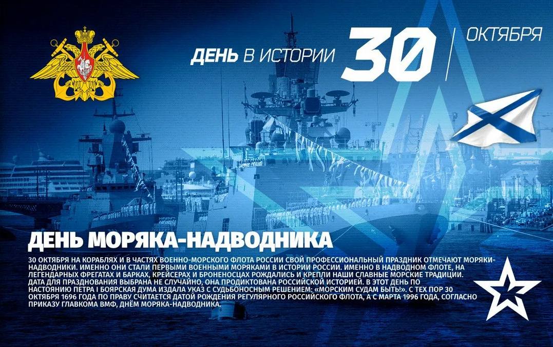 Согласно приказу главнокомандующего ВМФ, в России 30 октября отмечается как профессиональный праздник- День моряка-надводника. Этот день посвящен тем, кто служит на надводных кораблях защищая морские рубежи и обеспечивая мощь и безопасность флота.