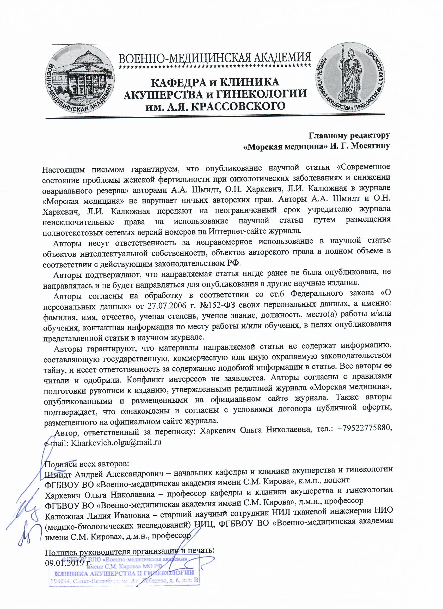 Начальник кафедры и клиники акушерства и гинекологии ФГБВОУ ВО "Военно-медицинская академия имени С.М.Кирова", к.м.н., доцент