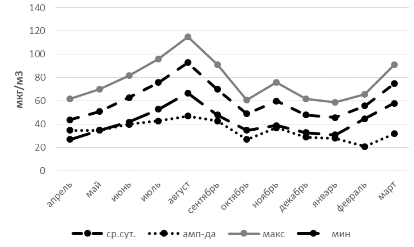 РЕЗУЛЬТАТЫ. Корреляционный анализ ежедневных, среднемесячных и сезонных данных по вызовам скорой помощи в связи с тяжелыми приступами БА и среднесуточных максимальных, минимальных КПО в течение астрономического года (апрель 2010 – март 2011 гг.) выявил однотипные по характеру зависимости от амплитуды изменений озона: статистически значимую в ноябре и на уровне тенденции – в сентябре 2010 г., что не дает достаточных оснований говорить о негативном влиянии озона на состояние больных БА на территории Южного берега Крыма. Проанализированы возможные причины выявленной слабой зависимости, при том что среднесуточные значения озона, как правило, были выше предельно допустимой концентрации в течение всего периода наблюдения, а в летнее время года – выше ПДК при 8-часовом воздействии.
