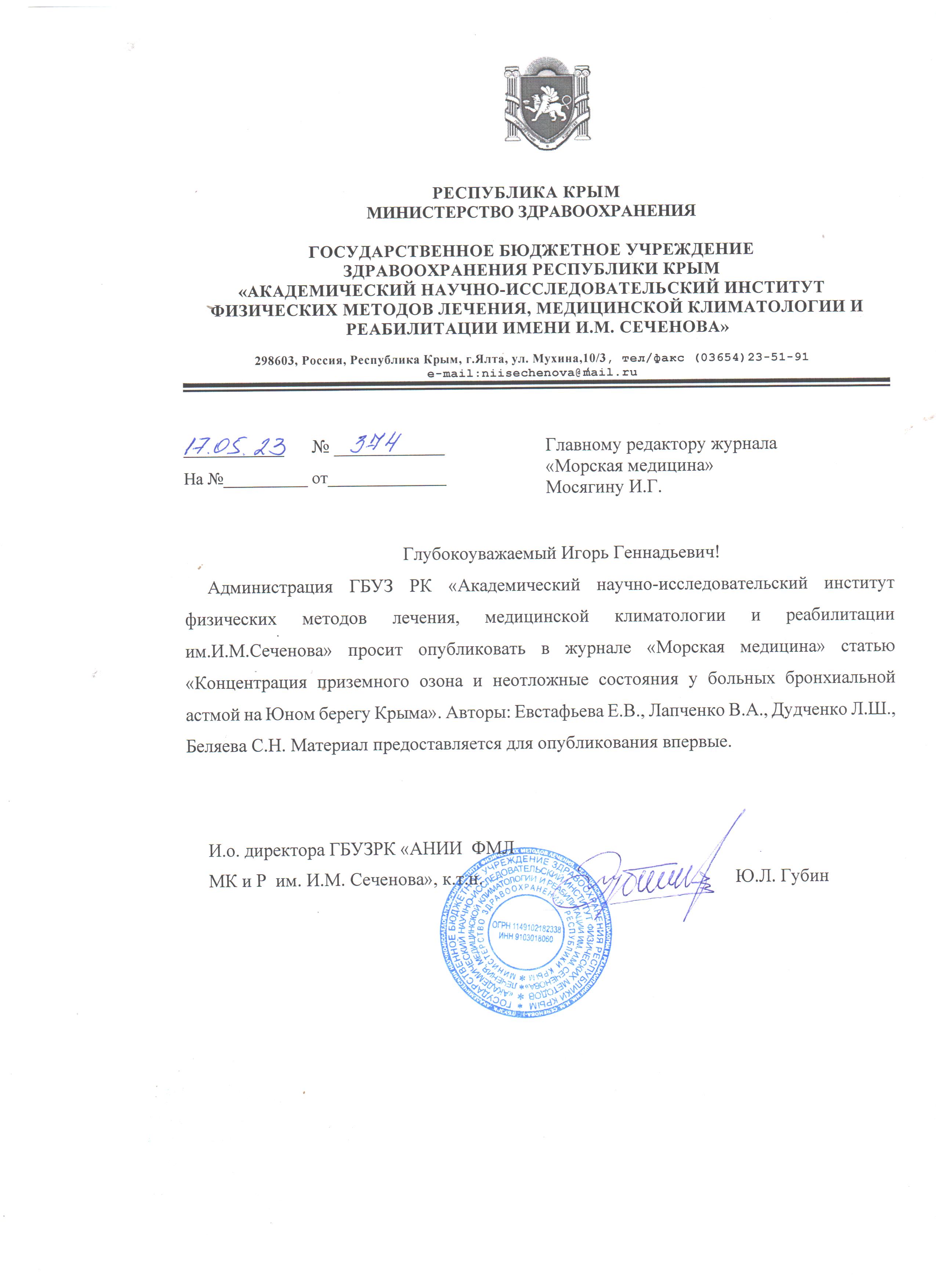Евстафьева Е.В., Лапченко В.А., Дудченко Л.Ш., Беляева С.Н. Концентрация приземного озона и неотложные состояния у больных бронхиальной астмой на Южном берегу Крыма. Морская медицина. 2023;9(4):40-50. https://doi.org/10.22328/2413-5747-2023-9-4-40-50