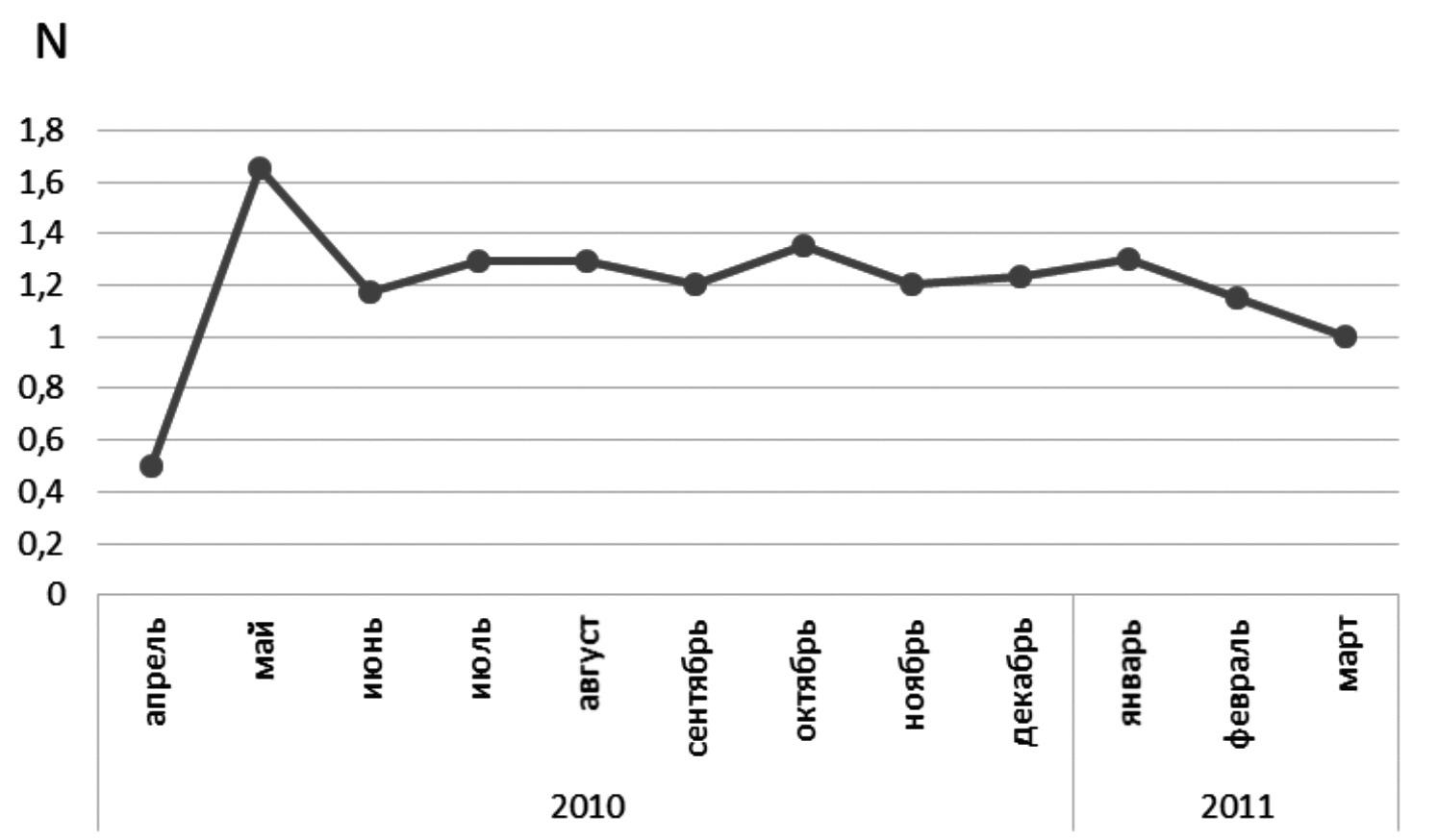 7. Рис. 1. Среднее количество вызовов скорой помощи больными бронхиальной астмой в месяц в течение астрономического года апрель 2010 – март 2011 г. | |