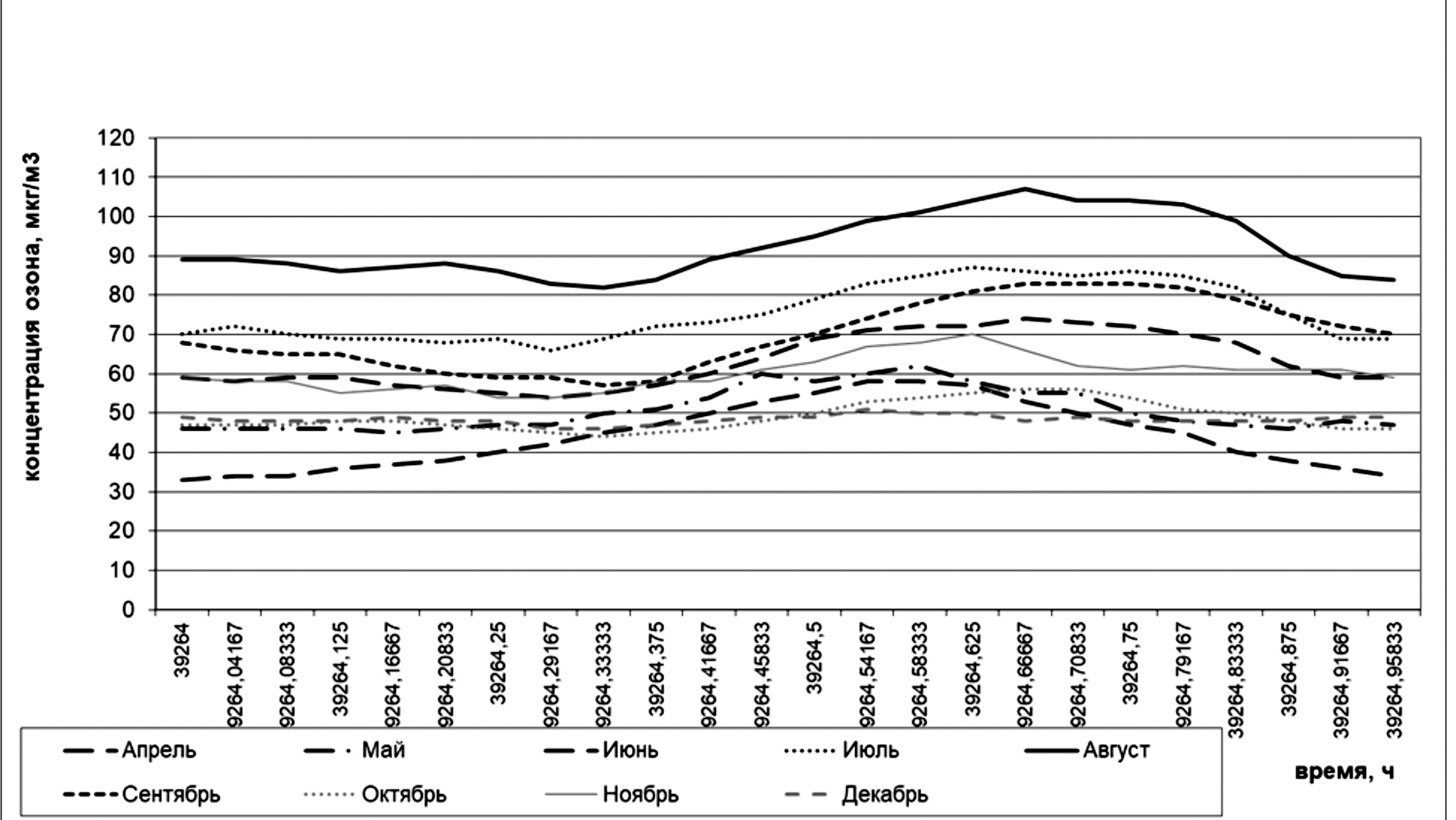 8. Рис. 2. Среднечасовые концентрации тропосферного озона в период с апреля 2010 по март 2011 г. | |