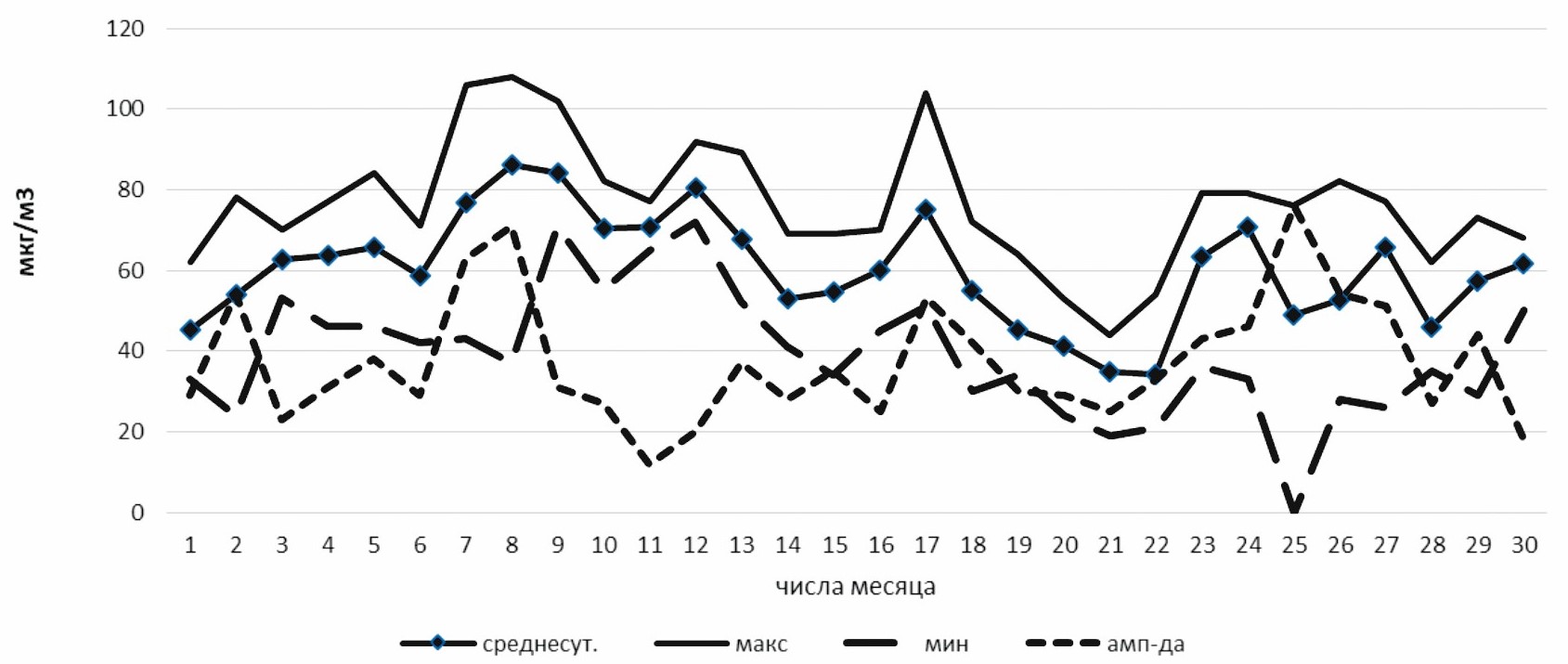 9. Рис. 3. Максимальные, минимальные, среднесуточные значения и амплитуда изменений концентрации приземного озона в ноябре 2010 г. | |