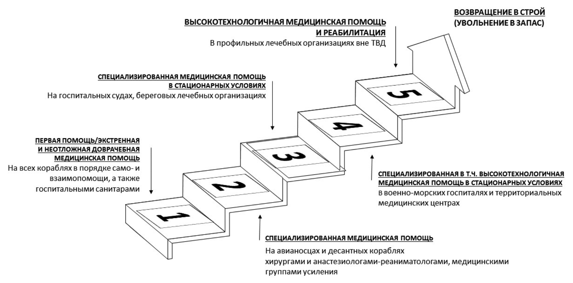 РЕЗУЛЬТАТЫ. Анализ доступных литературных источников позволил определить вероятный замысел организации медицинского обеспечения ОВМС НАТО, который обусловлен возможностями сил и средств медицинского обеспечения с возрастанием комплекса выполняемых лечебно-эвакуационных мероприятий на каждом уровне оказания медицинской помощи.