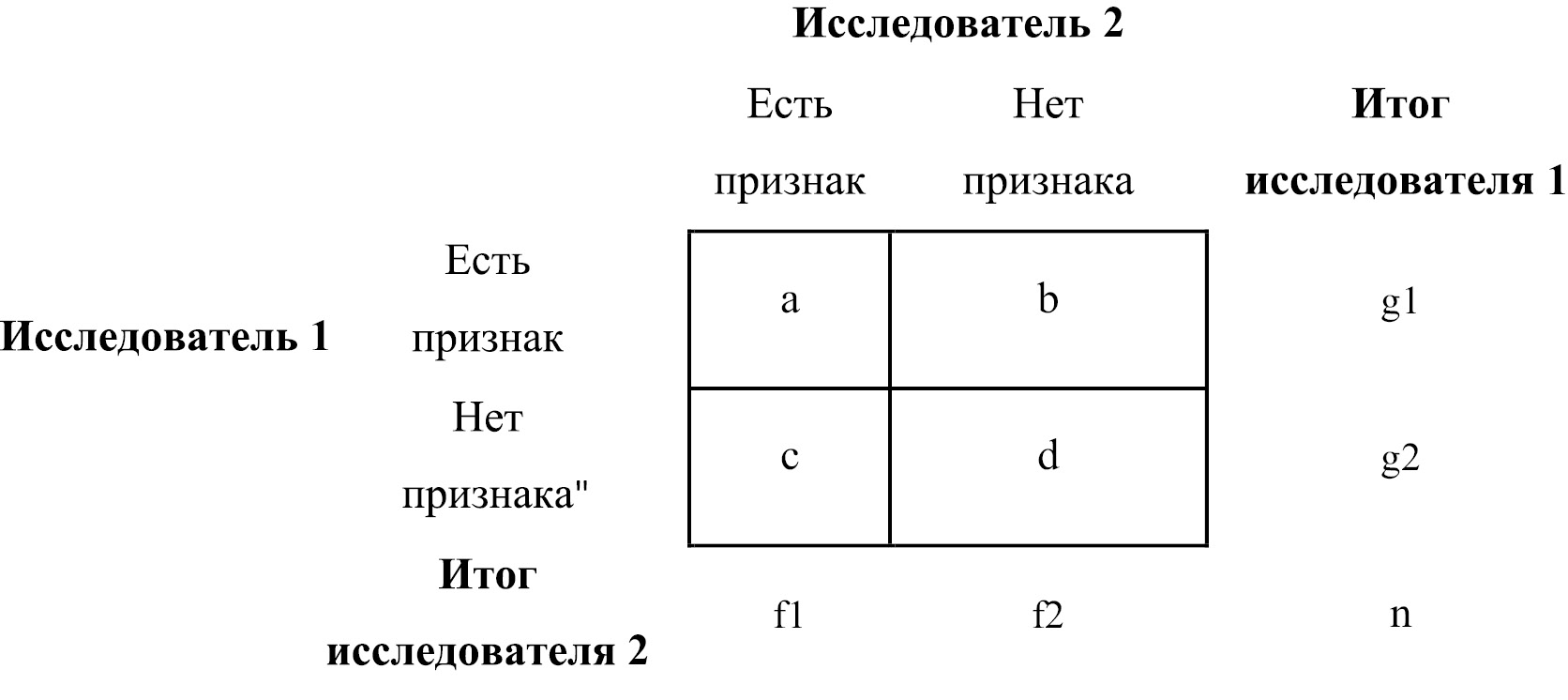 2. Рис. 2. Четырехпольная таблица для расчета каппа-статистики с помощью формул.