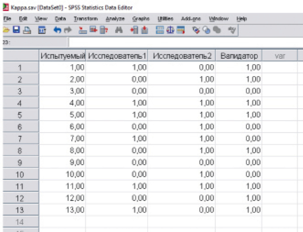 3. Рис. 3. Вид в программе SPSS данных примера из таблицы 1. | |
