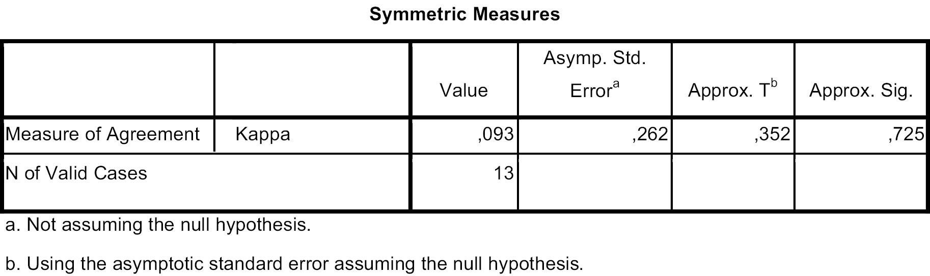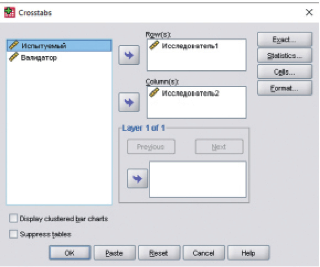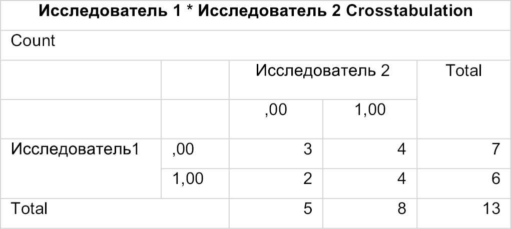 7. Рис. 7. Результат, выдаваемый SPSS о результатах расчета каппа-статистики. | |