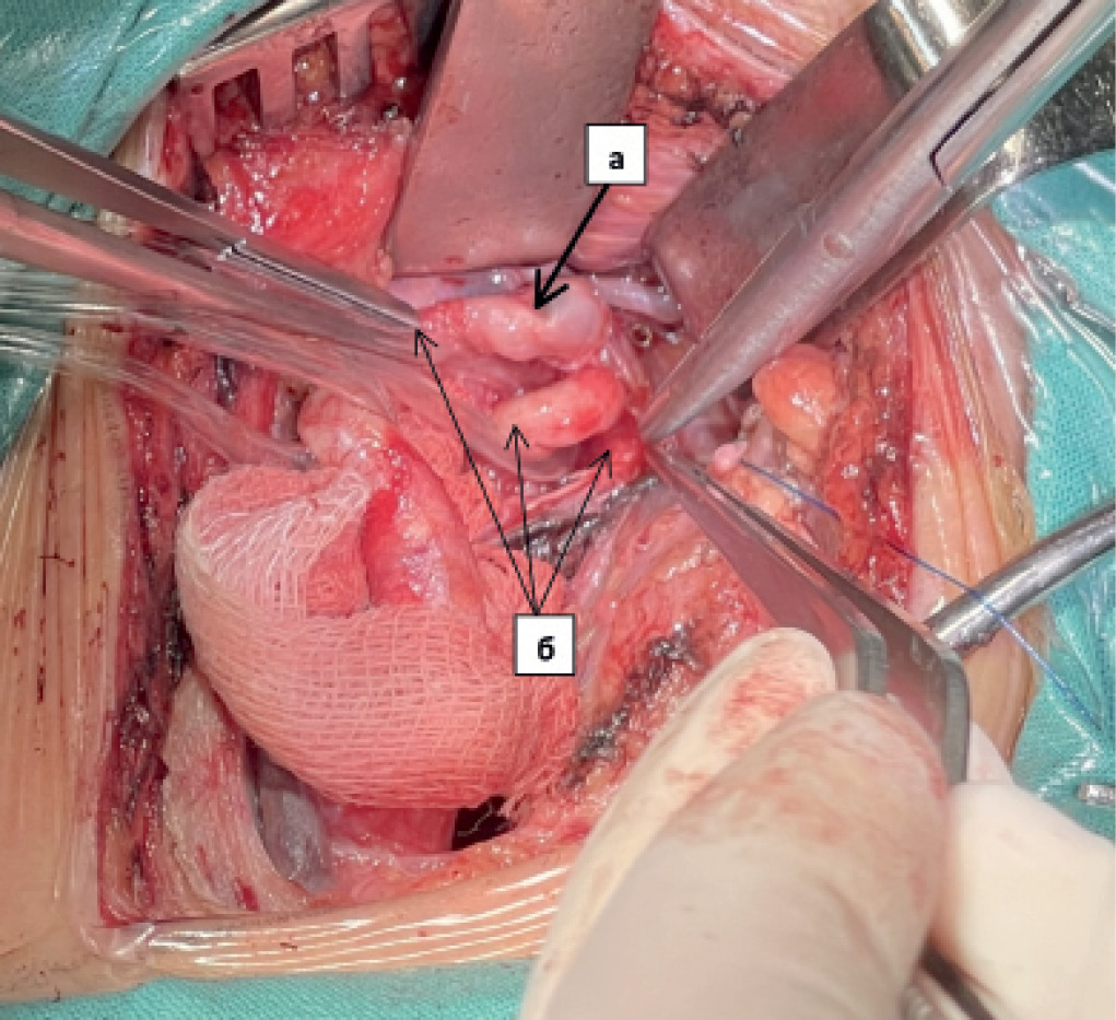 2. Рис. 2. Интраоперационное фото – мобилизация извитости ВСА, а – дивертикул ВСА; б – петли патологической извитости субкраниального сегмента ВСА | |