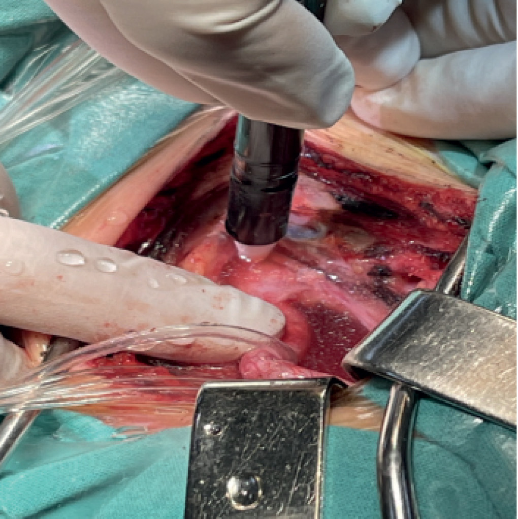 4. Рис. 4. Интраоперационно, по данным ультразвуковой допплерографии, визуализируется направление кровотока в проксимальном и дистальном коленах патологической извитости ВСА. а — направление тока крови к датчику; б — направление тока крови от датчика. | |