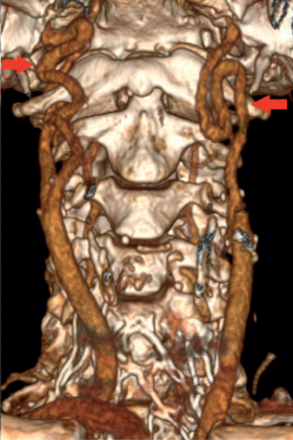 1. Рис. 1. СКТ-ангиография БЦА. Стрелкой указаны субкраниальные патологические извитости ВСА