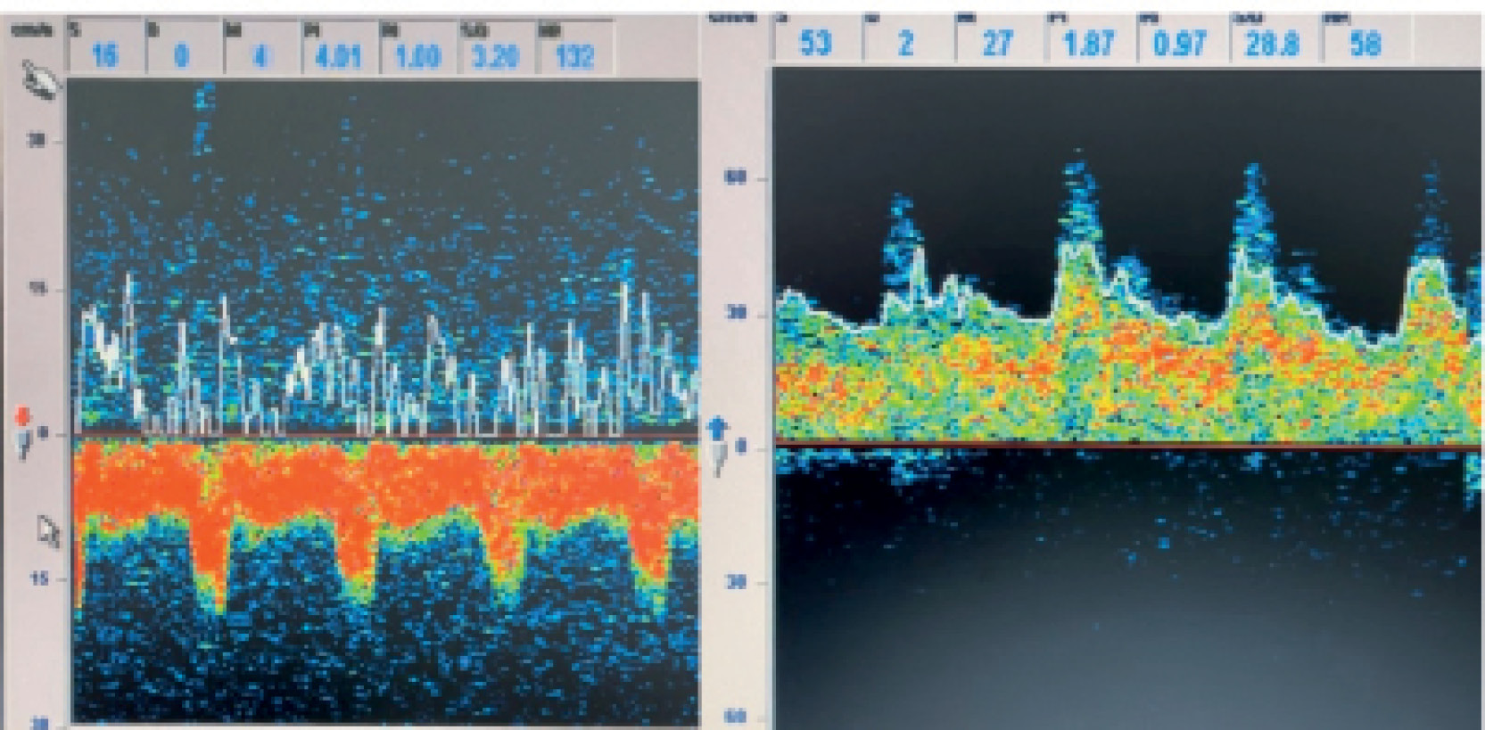 4. Рис. 4. Интраоперационно, по данным ультразвуковой допплерографии, визуализируется направление кровотока в проксимальном и дистальном коленах патологической извитости ВСА. а — направление тока крови к датчику; б — направление тока крови от датчика.
