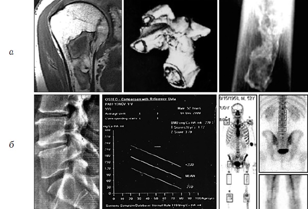 1. Рис. 1. Результаты обследования акванавтов: а – специфические костно-суставные изменения (по данным МРТ, КТ и цифровой рентгенографии); б – дегенеративно-дистрофические процессы в позвоночнике, данные КТ-денситометрии и остеосцинтиграфии (собственные данные) | |