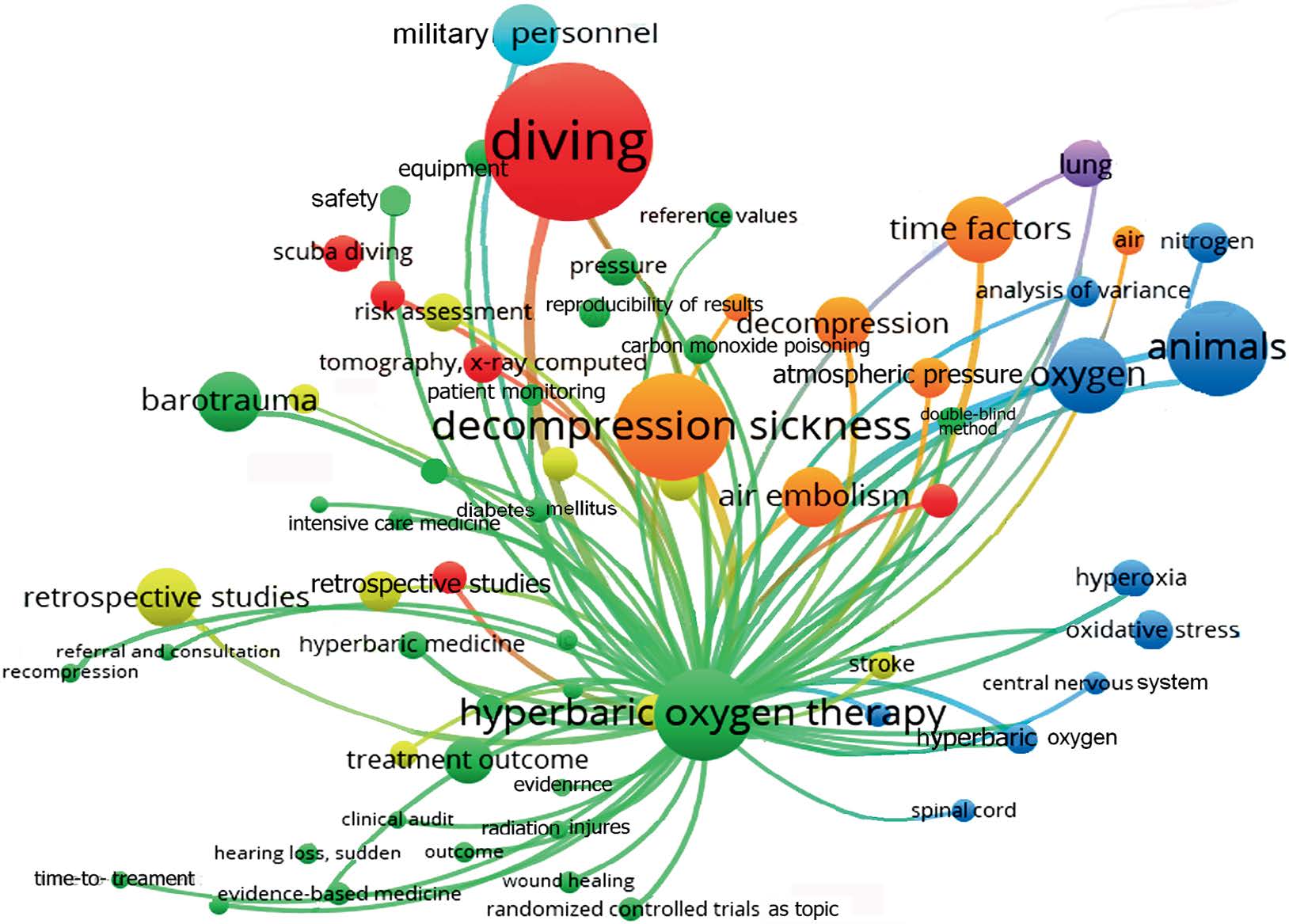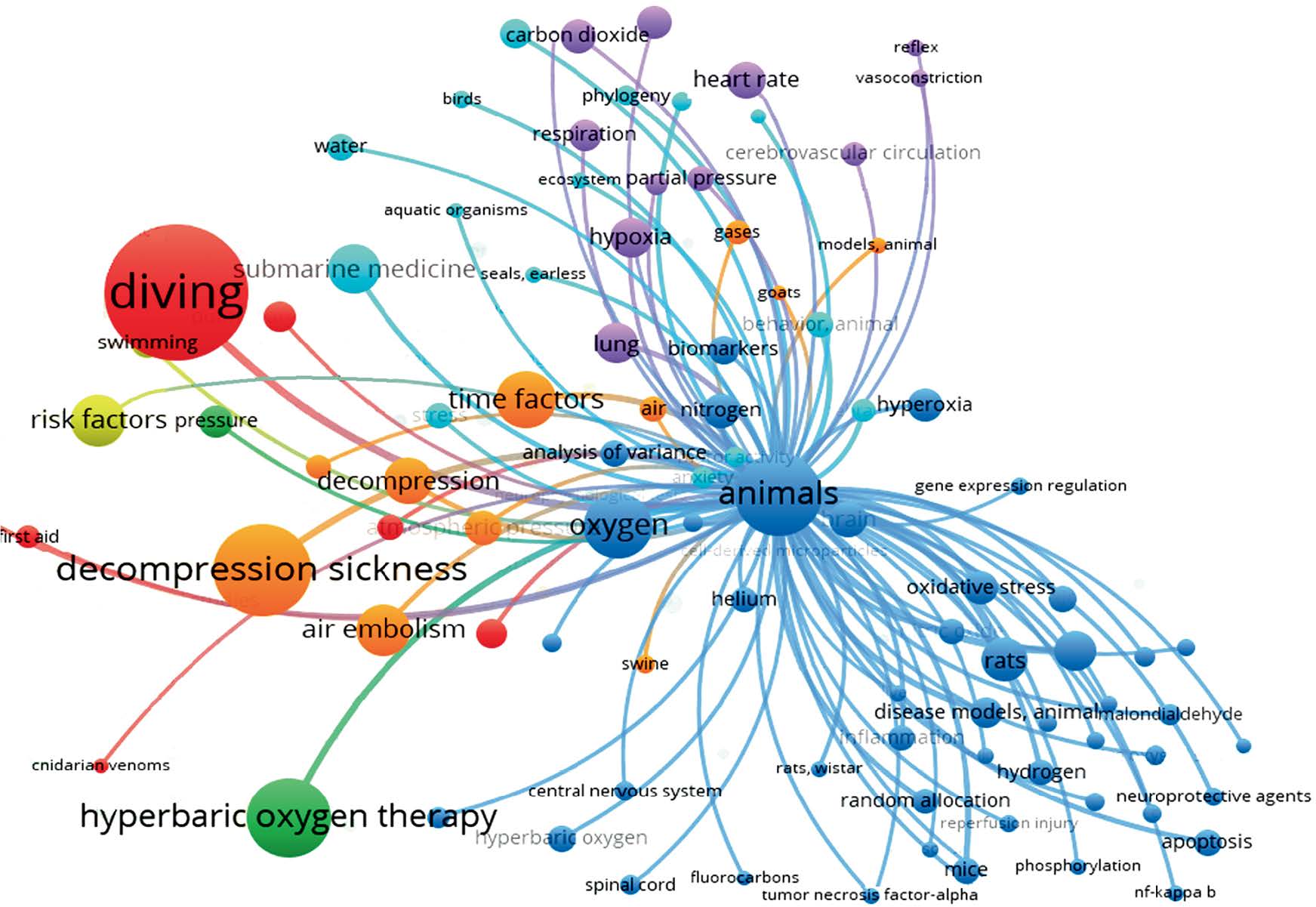 ЦЕЛЬ. Повысить информационные возможности ученых, для чего провести анализ направлений научных исследований в зарубежных статьях по подводной медицине с использованием программы VOSviewer за 20 лет с 2003 по 2022 г.