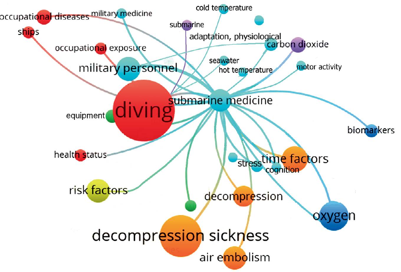 МАТЕРИАЛ И МЕТОДЫ. При помощи поискового запроса (Submarine Medicine) OR (Diving medicine) в справочно-библиографической базе данных PubMed получили 2476 откликов на научные статьи, опубликованные в 2003–2022 гг. Созданный массив публикаций в формате «.txt» загрузили в аналитическую программу VOSviewer 1.6.20, способную быстро распознавать закономерности в больших массивах библиографических данных. В массиве статей было 6786 ключевых слов. При учете 10 повторений ключевых слов в статьях их стало 358 и они были объединены в 7 кластеров.