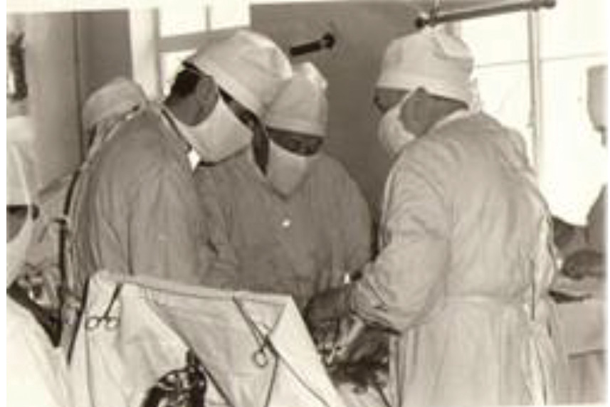 6. Рис. 6. Оперирует профессор М. А. Лущицкий, ассистируют доцент В. С. Мжельский и адъюнкт И. П. Миннуллин, 1976 г. | |