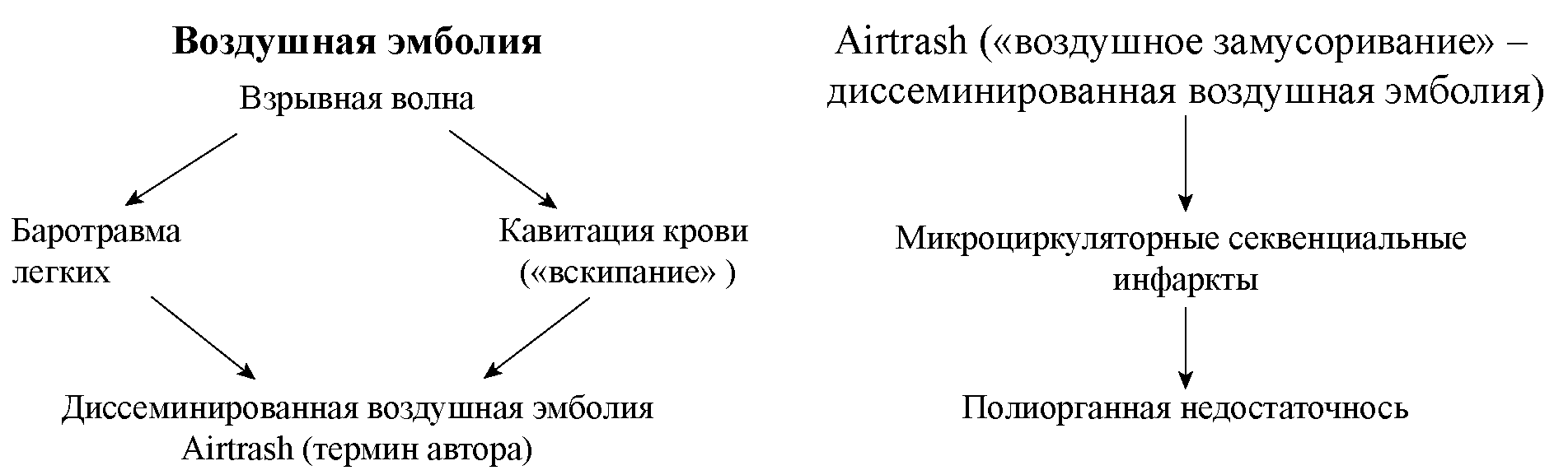 ЦЕЛЬ. Сместить фокус внимания практических врачей на патогенетическую роль внутрисосудистых газовых пузырей, вероятность возникновения которых велика при ранениях легкого, полых вен и венозных синусов головного мозга, а также при перепадах давления, имеющих место при воздействии на организм фронта ударной взрывной волны.