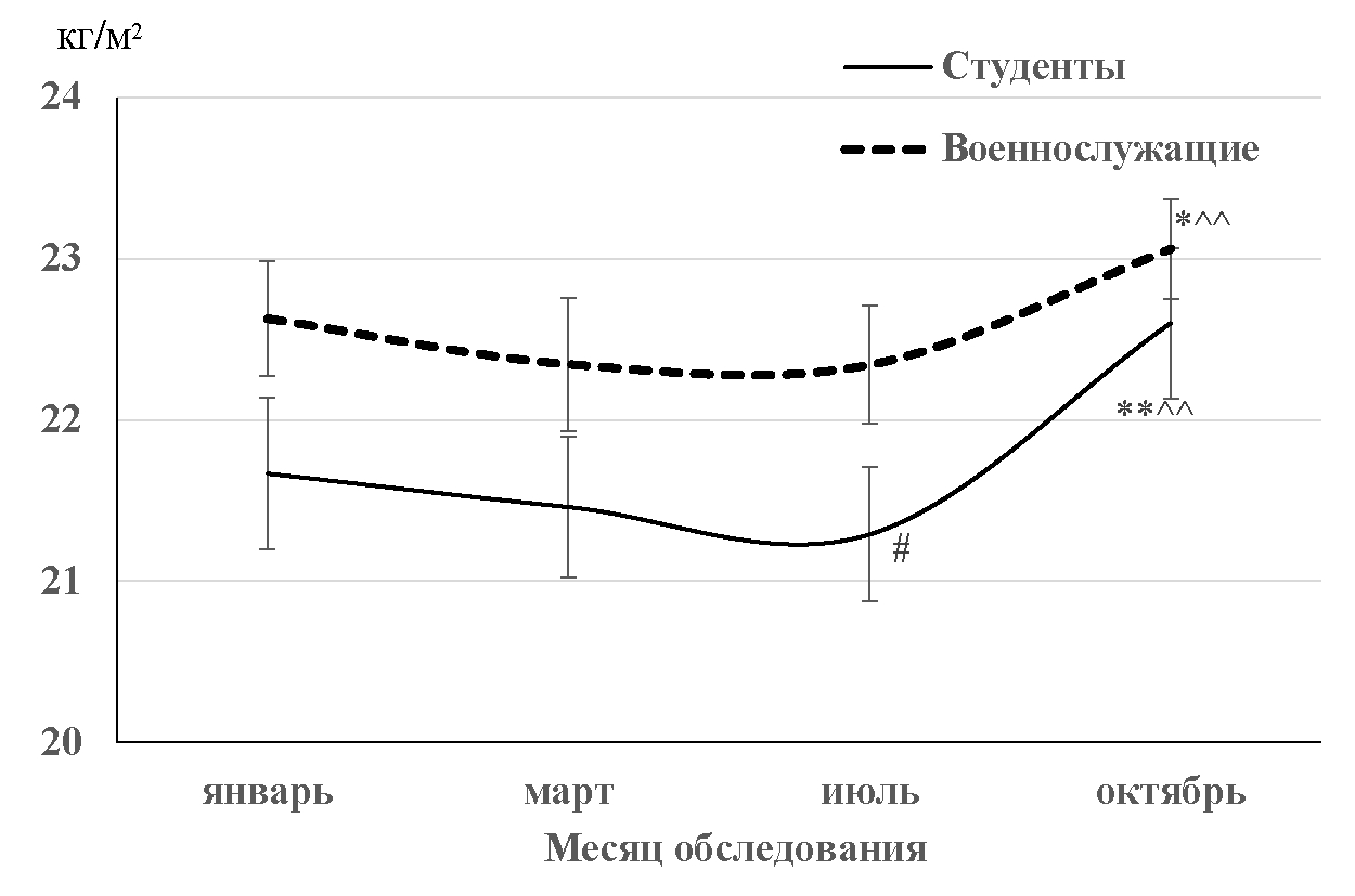 1. Рис. Сезонная динамика индекса массы тела у обследованных молодых мужчин. Достоверность различий в группах между месяцами: относительно января # – p < 0,05; относительно марта: *– p < 0,05; ** – p < 0,01; относительно июля: ^ – p < 0,05; ^^ – p < 0,01. | |