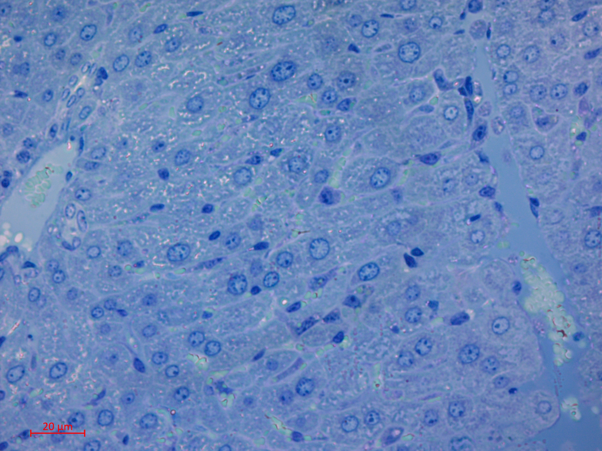 3. Рис. 1. Печень морской свинки при острой декомпрессионной болезни. Выражена интенсивная вакуолизации цитоплазмы гепатоцитов, расположенных по периферии дольки. Вакуоли более крупного диаметра, локализованные около ядра, предположительно, – газовые пузырьки. Полутонкий срез. Окраска толуидиновым синим. Масштабный отрезок – 20 мкм. | |