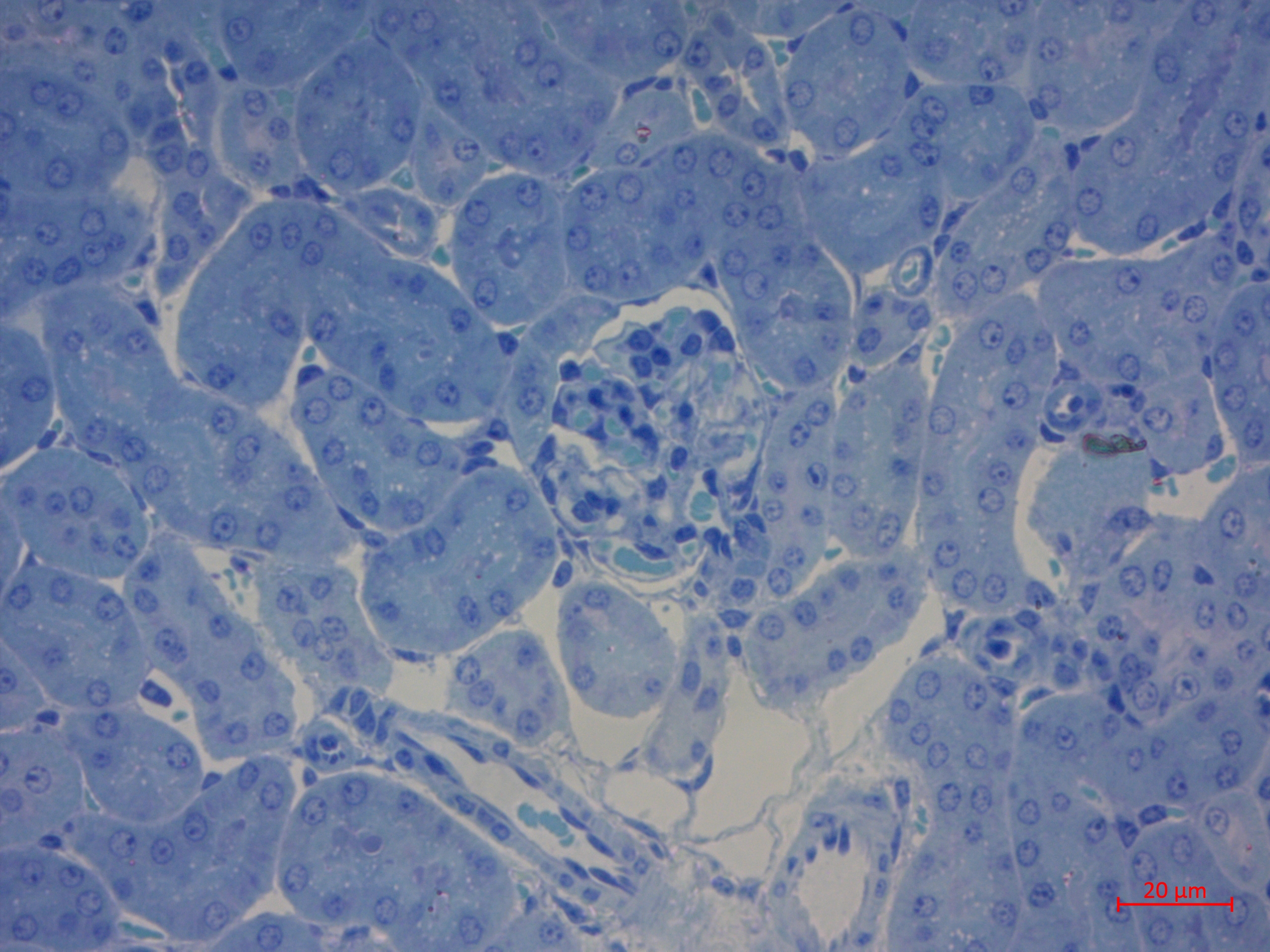 4. Рис. 2. Почка морской свинки при острой декомпрессионной болезни. Мелкодисперсная вакуолизация и более крупная вакуолизация в структурах нефронов. Стаз капилляров микроциркуляторного русла почечного тельца. Полутонкий срез. Окраска толуидиновым синим. Масштабный отрезок – 20 мкм. | |