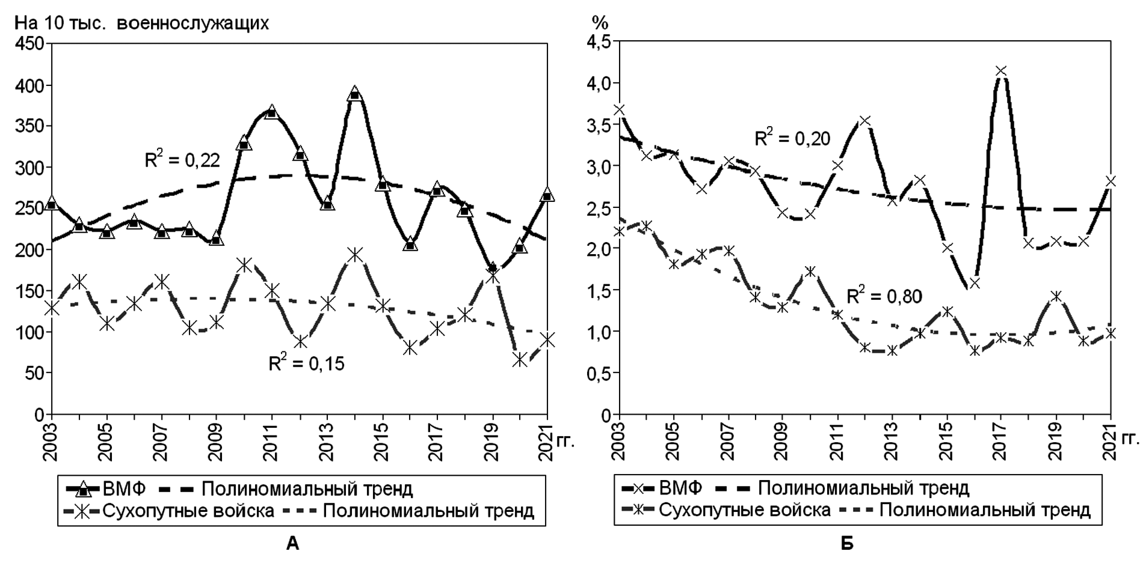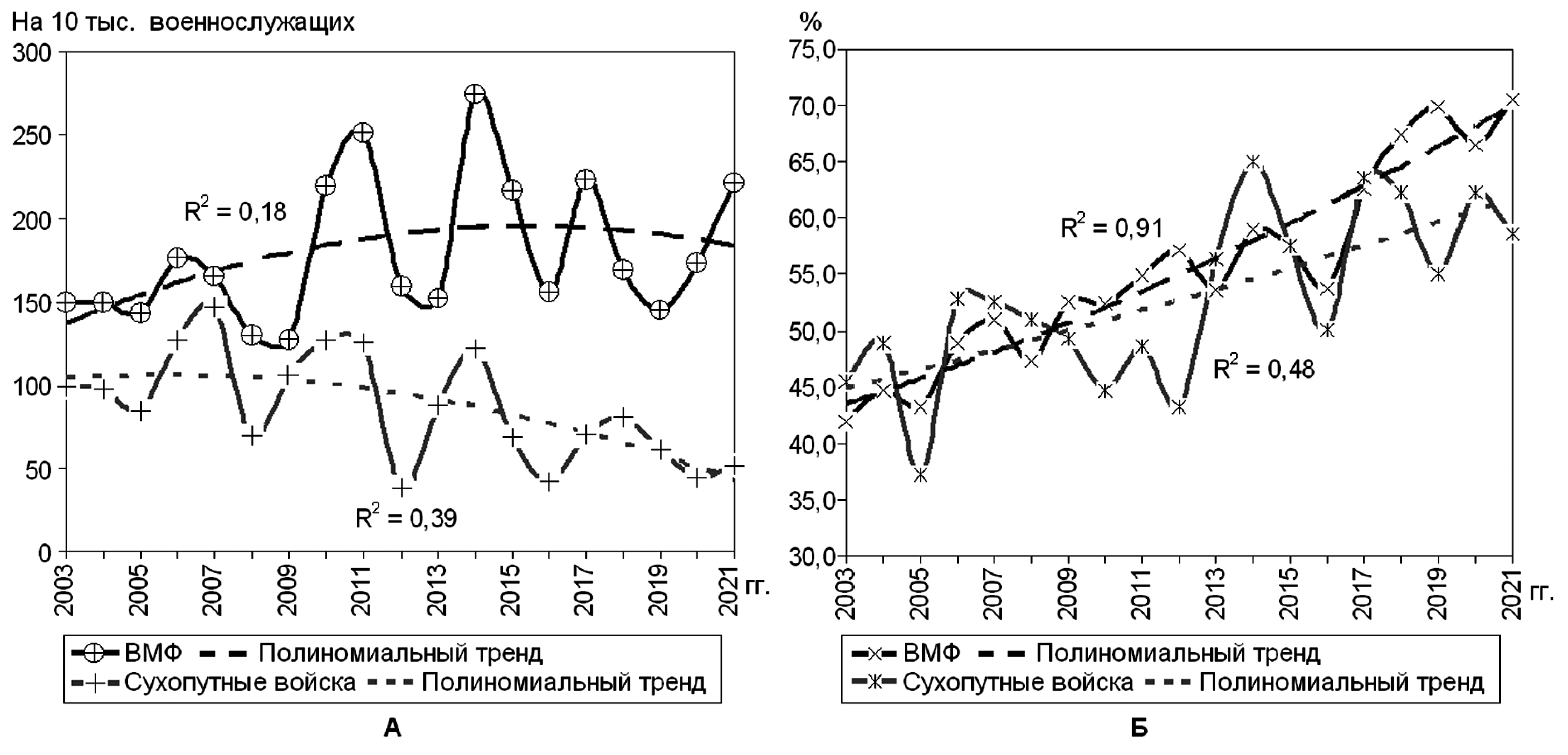 Динамика показателей психического здоровья военнослужащих, проходящих военную службу по призыву в Военно-Морском Флоте и Сухопутных войсках Минобороны России (2003–2021 гг.): Ретроспективное исследование