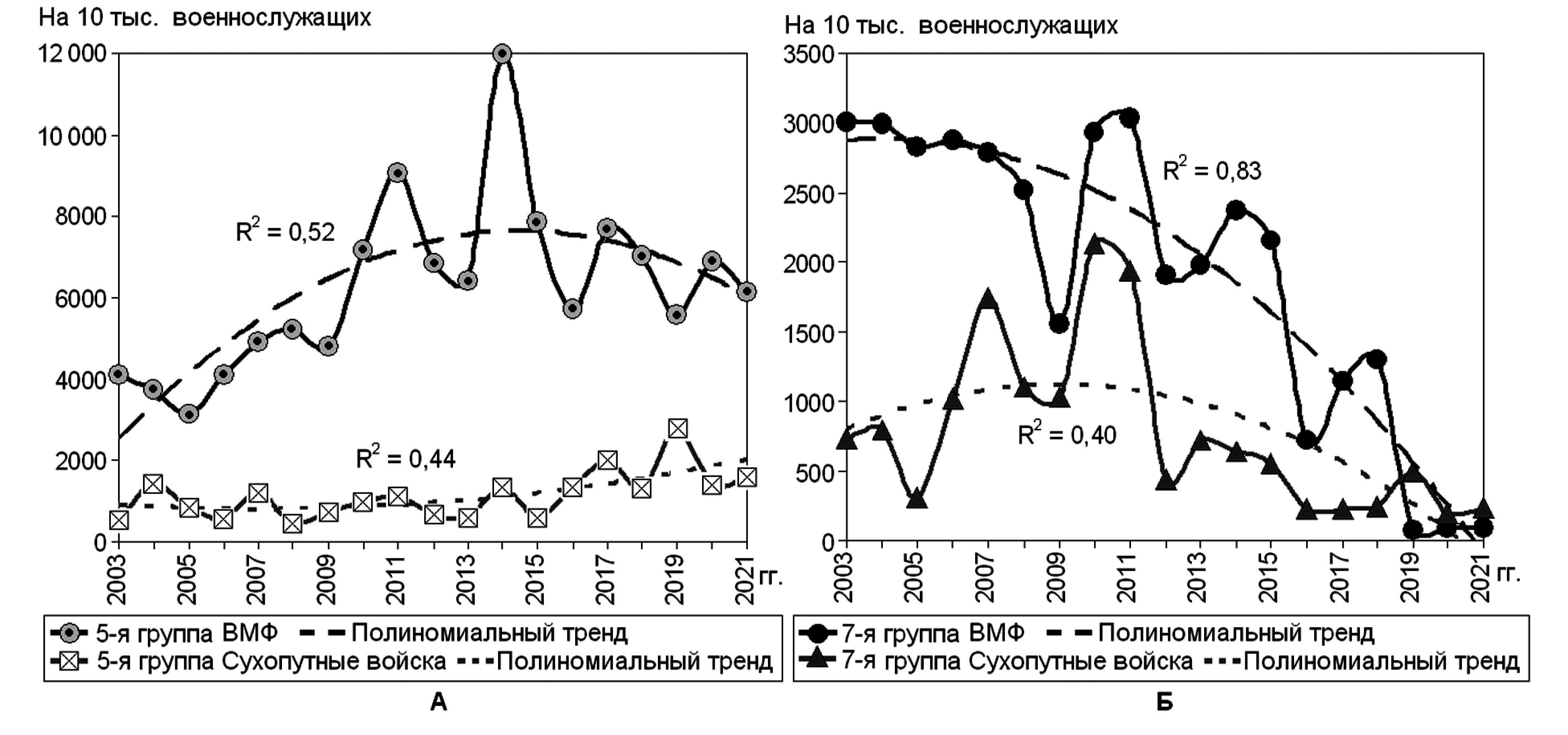 2. Рис. 2. Динамика уровней общей заболеваемости военнослужащих по призыву с невротическими, связанными со стрессом и соматоформными расстройствами (5-я группа) (А), расстройствами личности и поведения в зрелом возрасте (7-я группа) (Б). | |